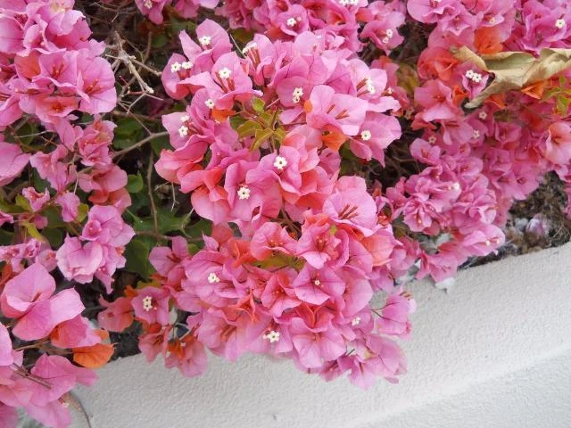Bougainvillea are long flowering and can be adapted for a wide variety of landscaping uses. Some of these uses include topiary, hedging, hanging baskets, arbours and arches. Today’s Bougainvillea have a great range in growth habit and height. There are dwarf varieties that grow to only a metre, compact medium growers and some such as White Cascade that offer a beautiful cascading habit.