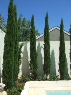 Cupressus sempervirens ‘Nitschke’s Needle’ has a slender columnar growth habit. The tiny, dark green, scale-like, aromatic leaves are arranged in slightly flattened sprays. This handsome conifer, with it’s needle-shaped silhouette, creates the classic avenue planting. It is a commanding feature tree, makes ideal sentries for either side of a gate or doorway or can stand alone as a striking container specimen. It takes approximately 10 years to reach it’s mature height.