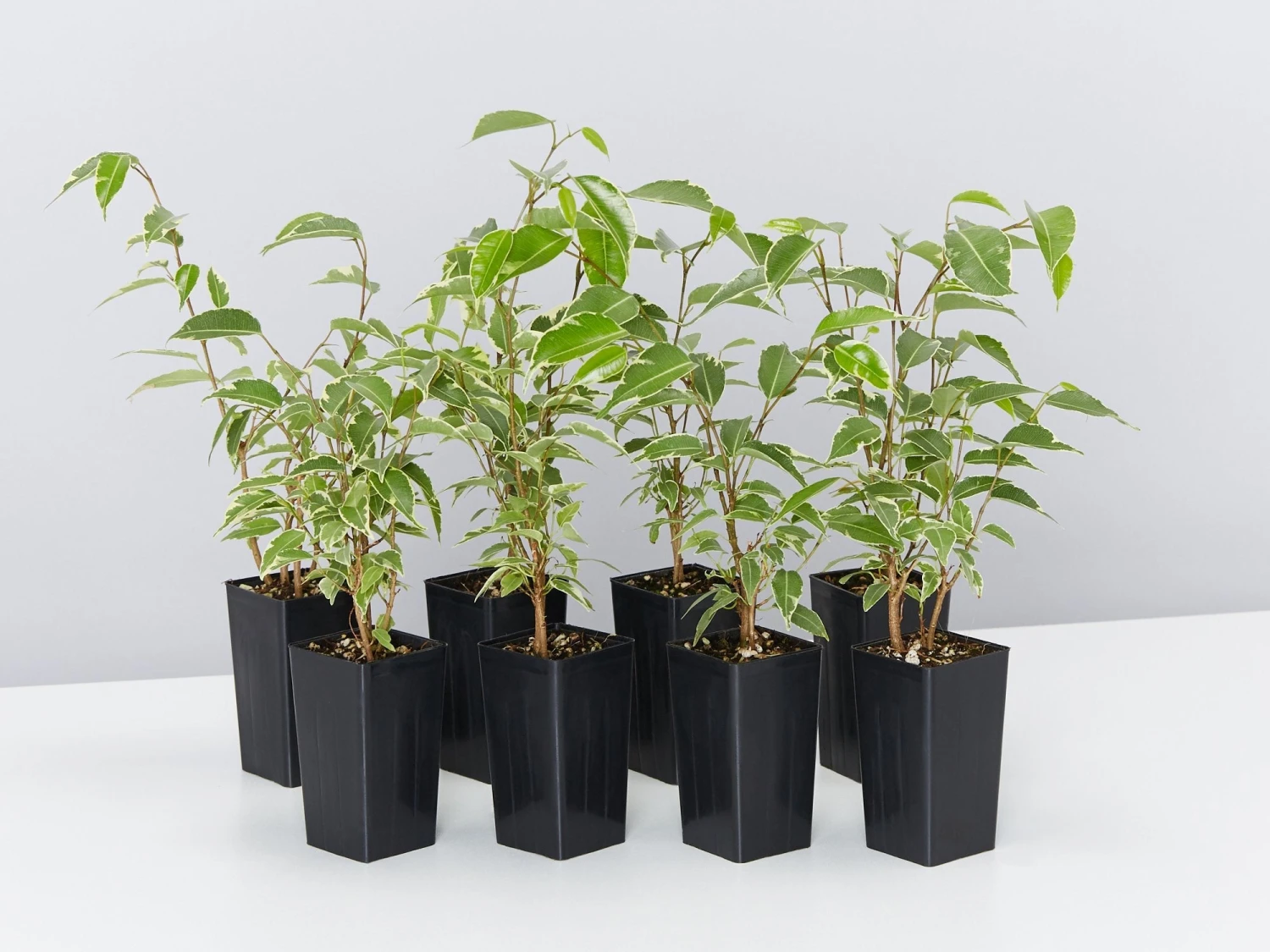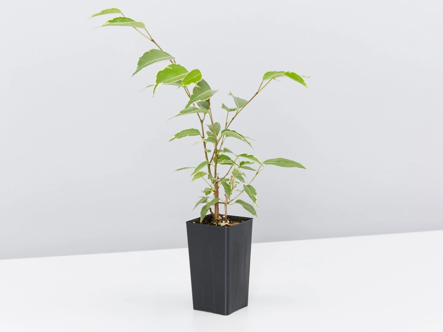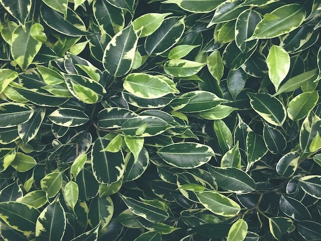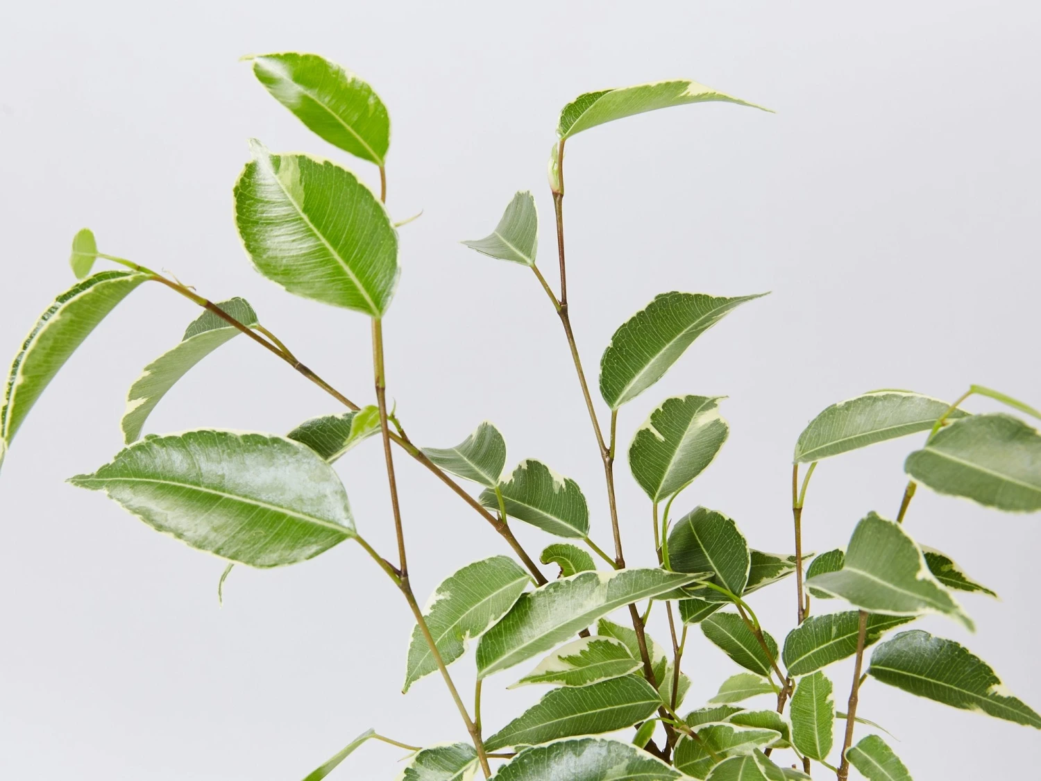 Ficus benjamina Variegata “variegated weeping fig” is one of the most common houseplants. The green and cream-coloured leaves can be trained as a tree with a clear trunk or as a bush with leaves from the top of the plant to the soil level.
