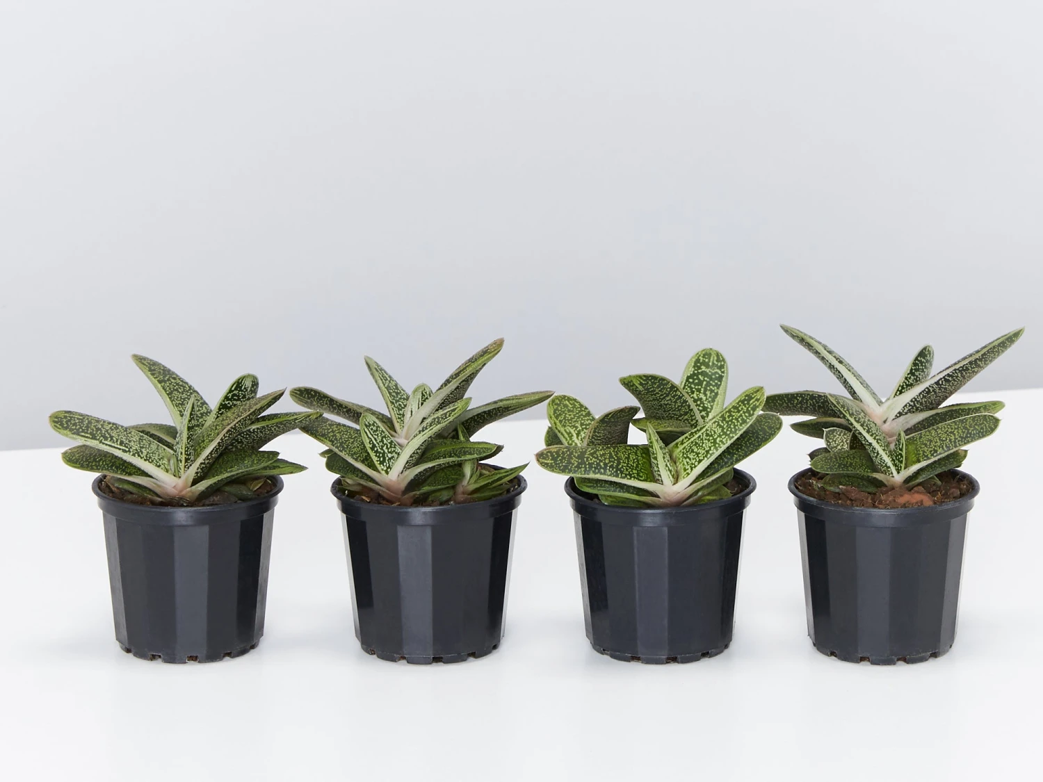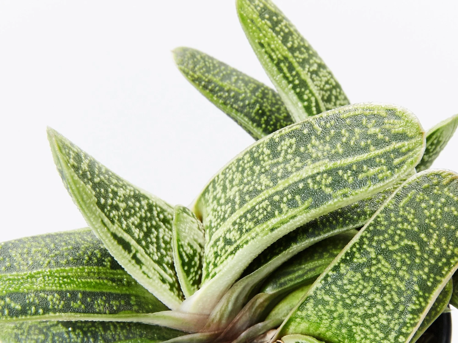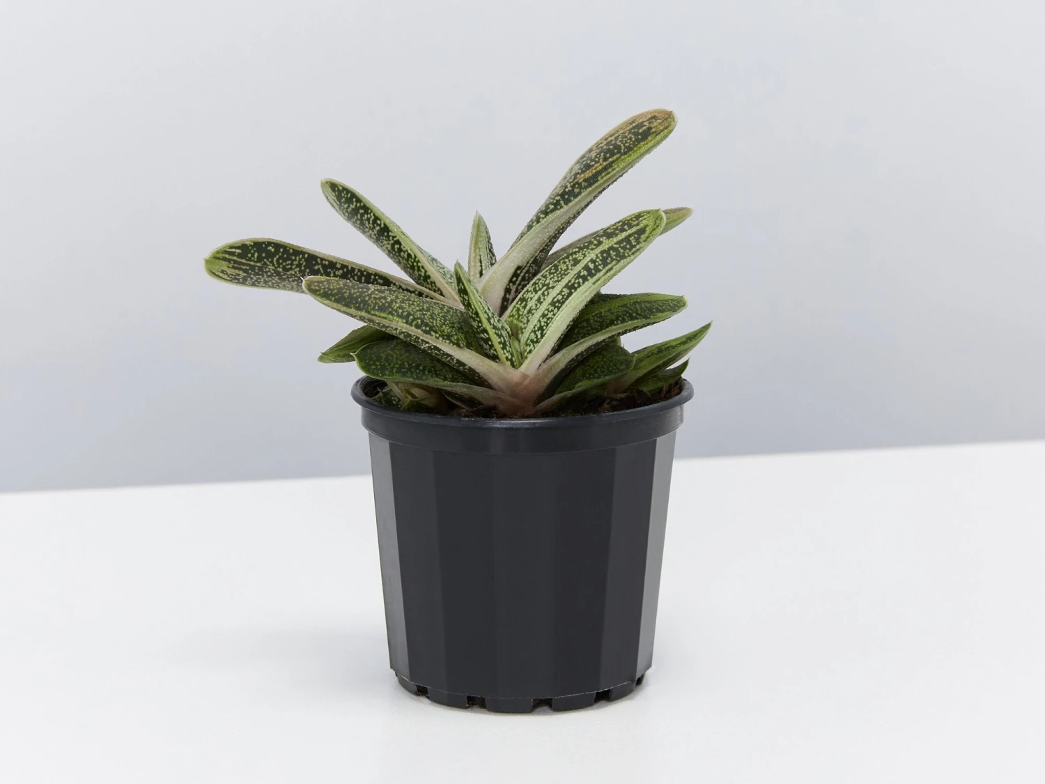 Gasteria Little Warty is a white and green succulent with thick almost plastic-looking leaves that form a tight spiral.Â