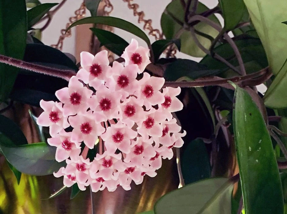 The Hoya carnosa Pink is also commonly known as the Wax Plant, Hindu Rope Plant or the Waz Stemmed Plant. This hardy indoor climber has been around forever. She is a gorgeous tropical climber with big green leaves and clusters of waxy pink flowers that are shaped like little stars. This indoor houseplant is a favourite amongst collectors, indoor plant enthusiasts and the amateur green thumb.Â