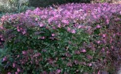 Ooooh – check out China Pink, she’s a real babe with lolly-pink fringed flowers in spring and summer that are arranged on delicately weeping stems of dark burgundy-coloured evergreen leaves. This plant creates a very pretty hedge whether in flower or not.