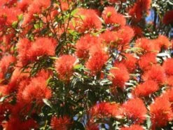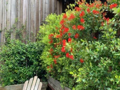 Metrosideros Fiji Fire is named for its dark green foliage that emerges in a flush of red new growth and a spectacular summertime show of fluffy tangerine redĀ flowers.