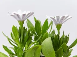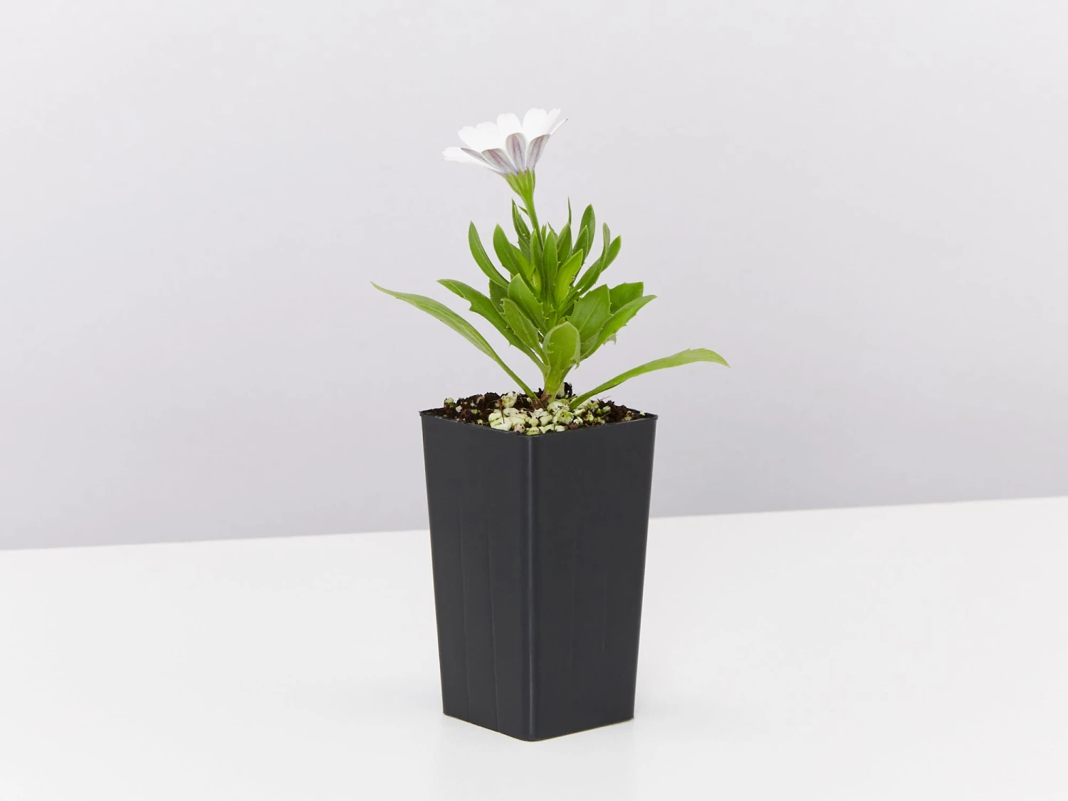 Osteospermum ecklonis Serenity White is a hard-working little dude who can handle drought, frosts and coastal conditions and look good while doing it too. He has soft green leaves with big white blooms with dark purple centres; he makes a super cool border plant for a full sun garden.Â