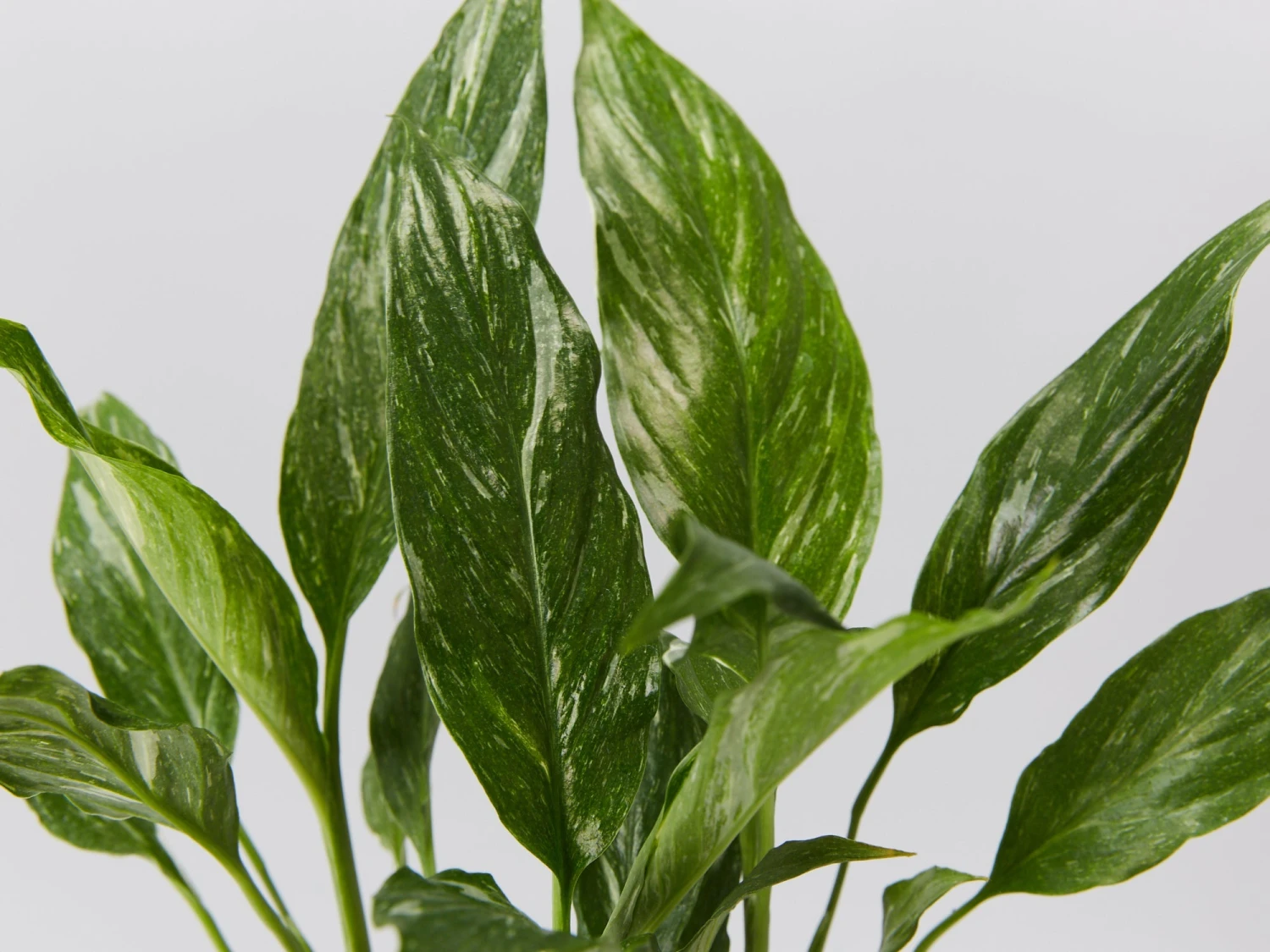 A rare and beautiful variety of the classic Peace Lily, Spathiphyllum Jet Diamond has glossy light green marbled tie-dye leaves, each one unique and unmistakable. Yep he does need more light than an average peace lily (the variegation means less chlorophyll, which means it picks up less light, so it needs more.)Â