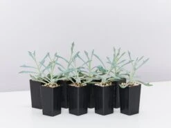 Senecio Trident Blue PBR is a fast, low growing groundcover that has powdery blue foliage and will bring colour and texture to your garden. Super popular with landscape architects the Trident Blue is a low maintenance, drought and frost tolerant succulent that can handle full sun. If you have a space in the sun where not much else will grow give this little guy a go and you’ll be sure to be rewarded. Â