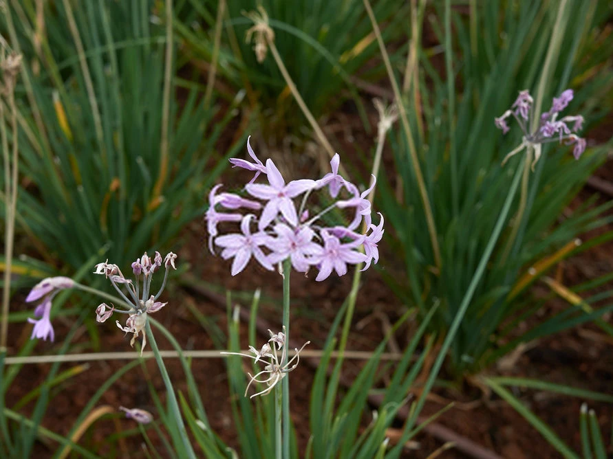 Tulbaghia cominsii x violacea Purple Eye has narrow grey-green leaves that form in upright clumps and produces small pink flowers with dark purple centres. When crushed the leaves have a strong garlic smell (hence the nickname Society Garlic). Purple Eye is a smaller more narrower version on the more common Tulbaghia violacea. This small plant is worth growing for the silver foliage and small flowers and does really well in a pot on sunny balcony.Â