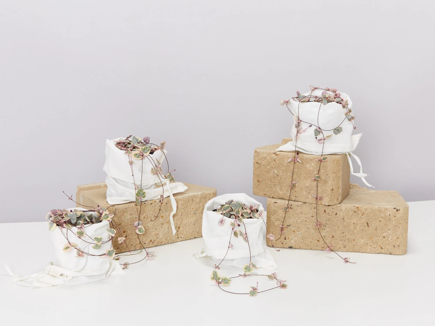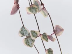 “Ceropegia Woodii Variegata” Oh the rarity of it all. A variegated version of Chain of Hearts (or sometimes called String of Hearts). A cute little heart-shaped leaf of pink, cream leaves with splashes of lime green and grey. She’s quite the lady! A delicate trailing plant. Her colours will change with the seasons, and the intensity of light and her leaves will grow on long vines.